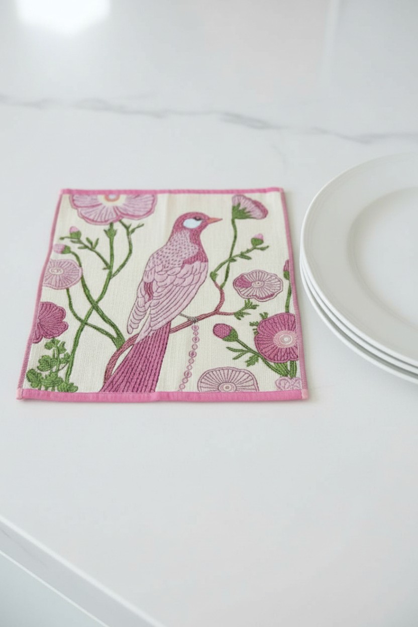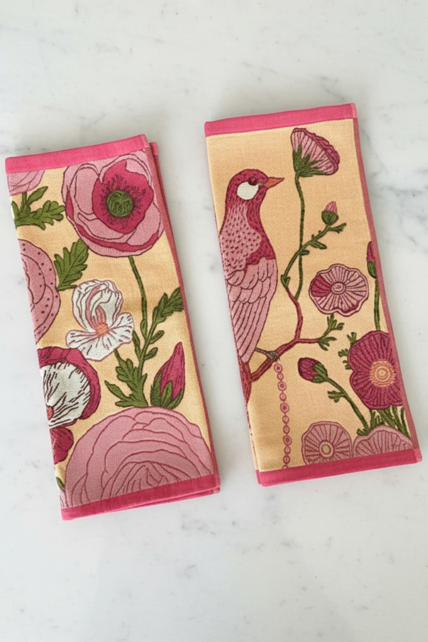 • Set of 2 premium cotton dish towels (15″ x 13″ each) – floral designs in pink and green and bird