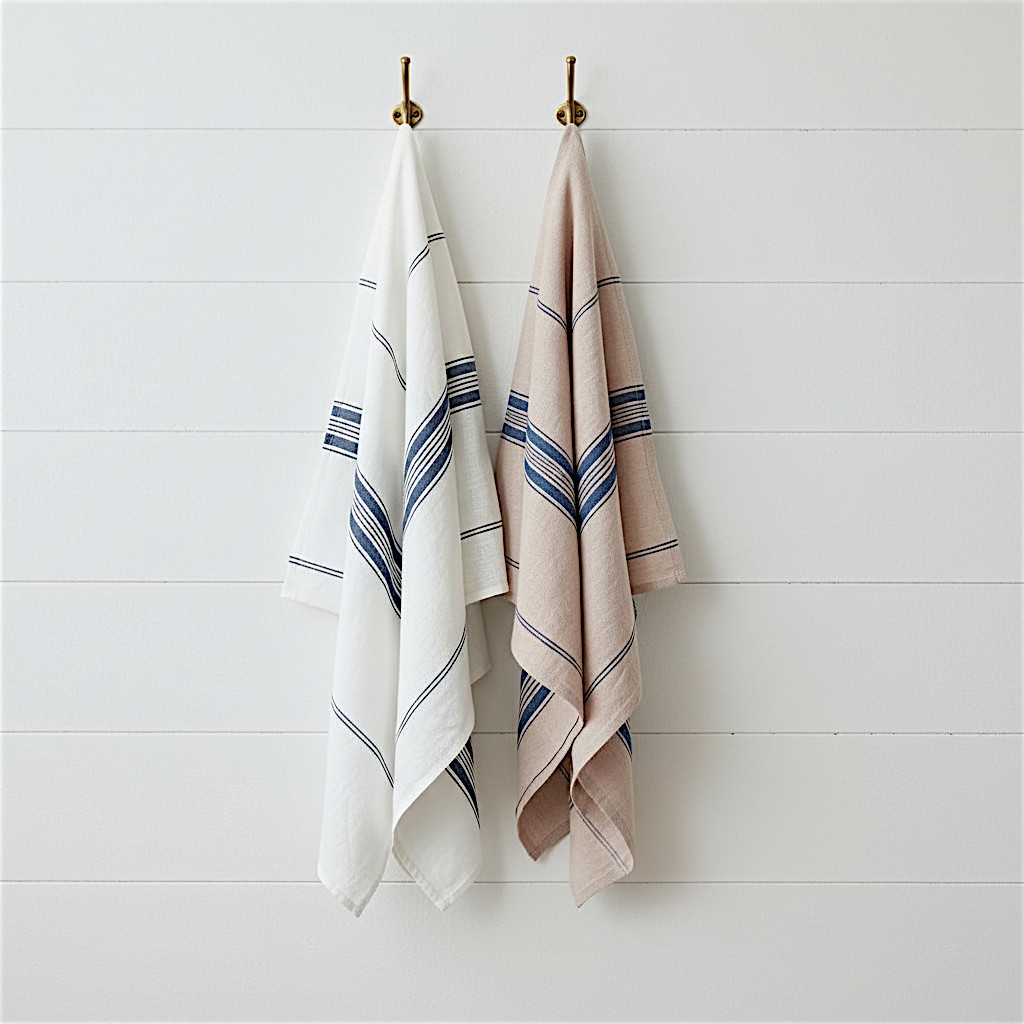 Crafted from beautiful white linen and finished with delicate blue and mauve stripe accents, these towels offer a relaxed yet high-end look that pairs effortlessly with farmhouse, cottage, coastal, and French-inspired kitchens.