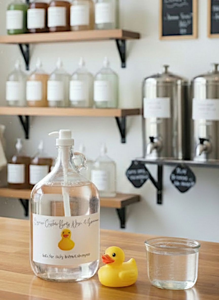 Supplied in a 1-gallon refill jug with pump, this format is designed for refill shops, natural retailers, and back-of-house use. It allows stores to refill smaller baby wash bottles while offering customers a low-tox, fragrance-free alternative to conventional baby cleansers.