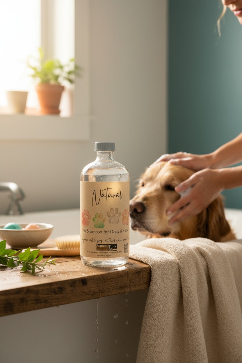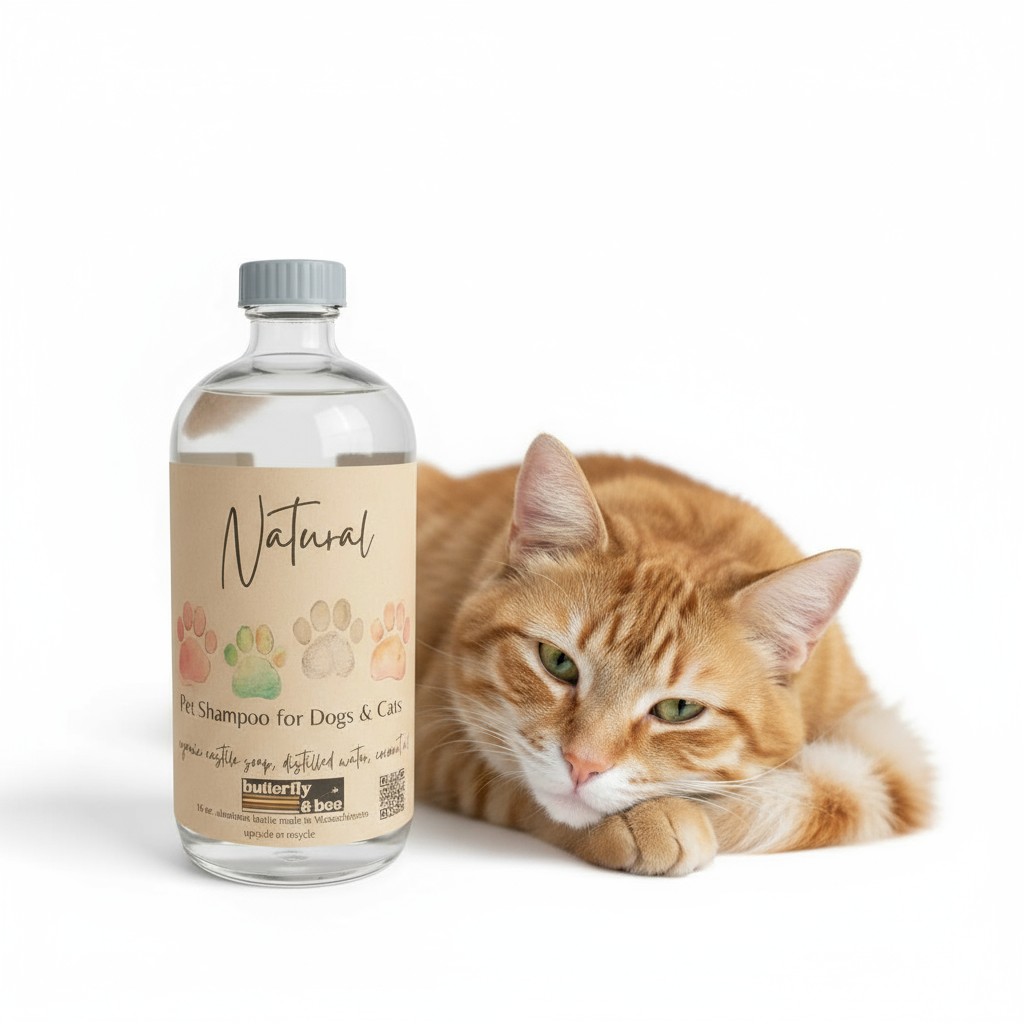 Our Natural Pet Shampoo is handcrafted with organic castile soap and pure, plant-based ingredients to cleanse and nourish your pet’s coat without irritation or harsh chemicals. Safe for both cats and dogs, this mild formula leaves fur soft, shiny, and naturally fresh.