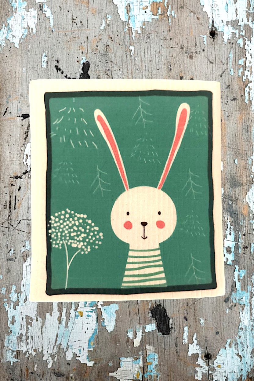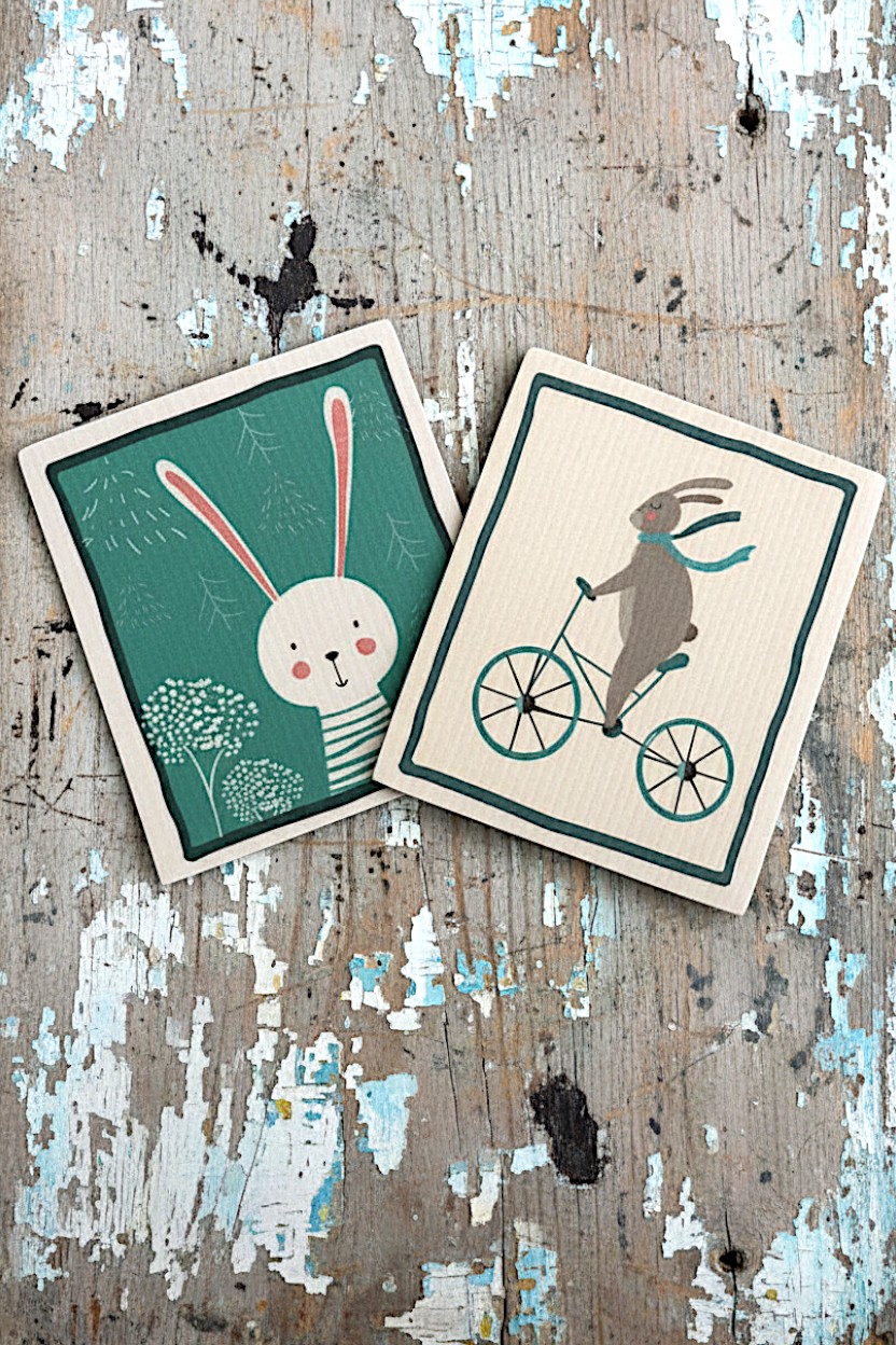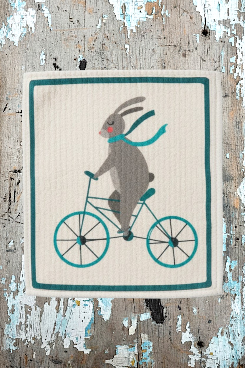 • Set of 2 uniquely designed Swedish dishcloths (7.5″ x 7″) featuring a gray rabbit riding a teal bicycle with matching scarf and a cute bunny face on teal background
