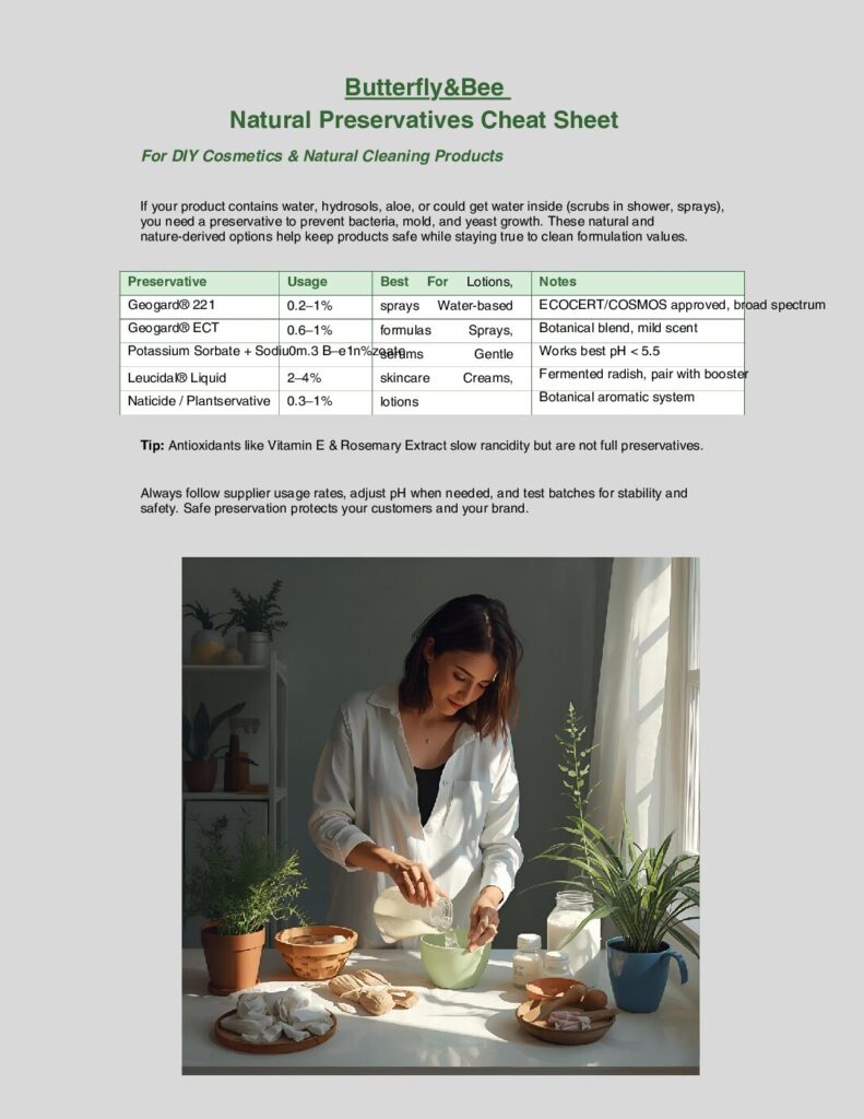 Nervous about selling products without preservatives, but we also want to stay true to your natural mission. If you’re making and selling your own cleaning supplies or personal-care products, you know the tension: keep it “clean” (minimal, natural ingredients) yet safe (microbial stability is real). Here’s a list of natural and nature derived preservatives, including essential Natural Preservatives, you can use and still live up to your ingredient transparency, earth-friendly branding, and Butterfly & Bee values. By incorporating additional Natural Preservatives, you enhance the safety and longevity of your products, ensuring they remain effective for your customers.